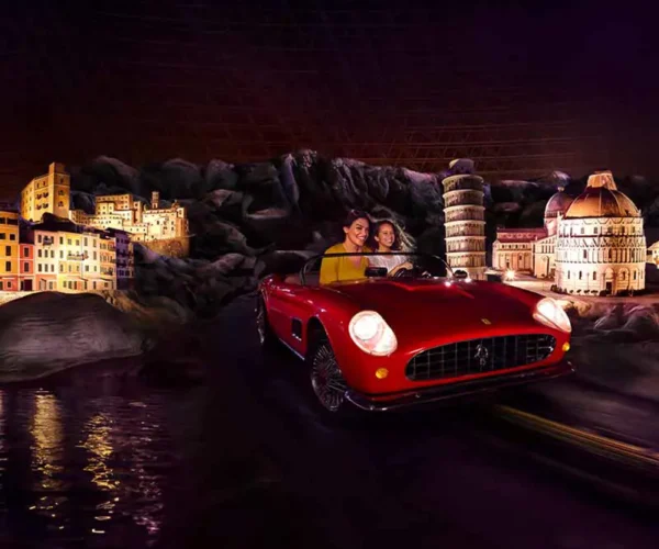 • Ferrari Mission: The most impressive mega-track in the world. A highly intense multi-sensory 5D roller coaster. It features the world's first side runway drop.
